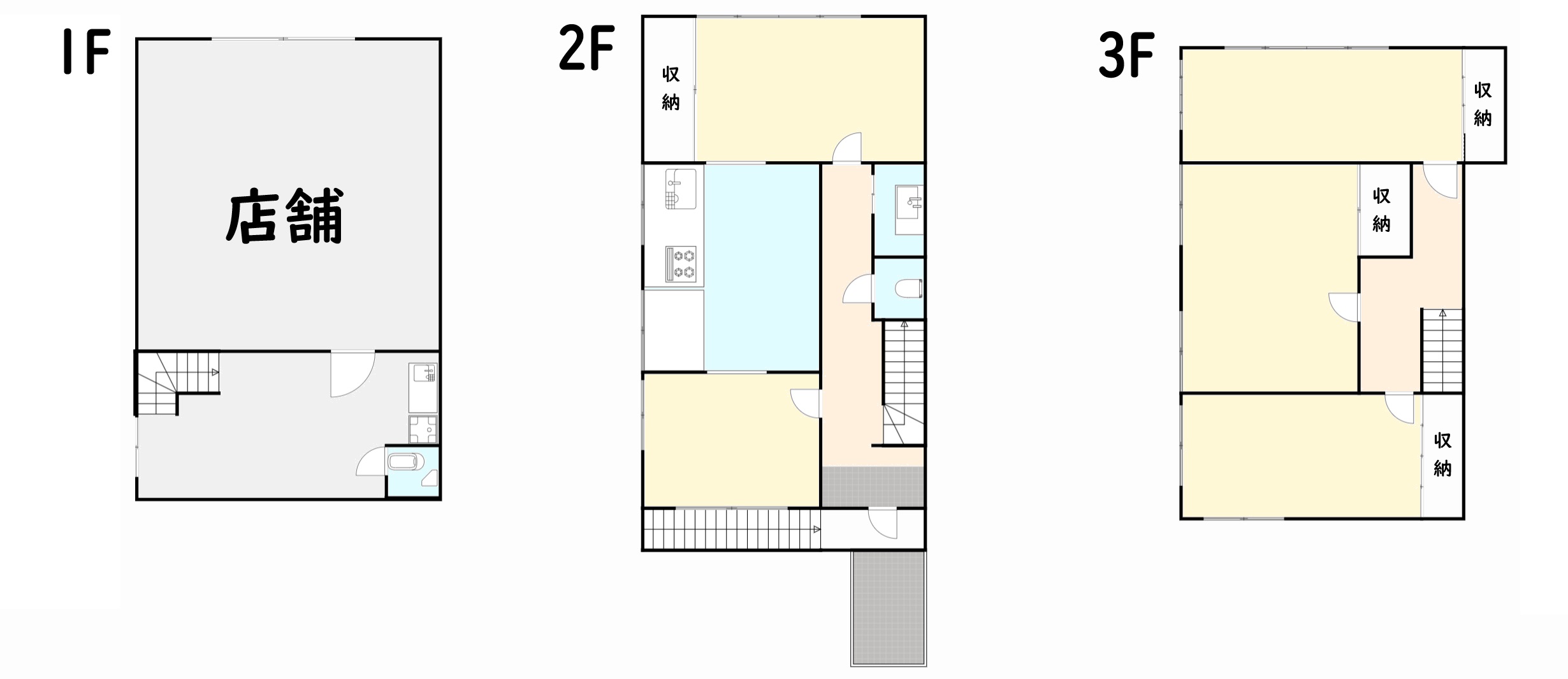 1Fは店舗 2Fと3Fは住宅になっています。店舗入り口は北向き、松ヶ崎通に面しています。