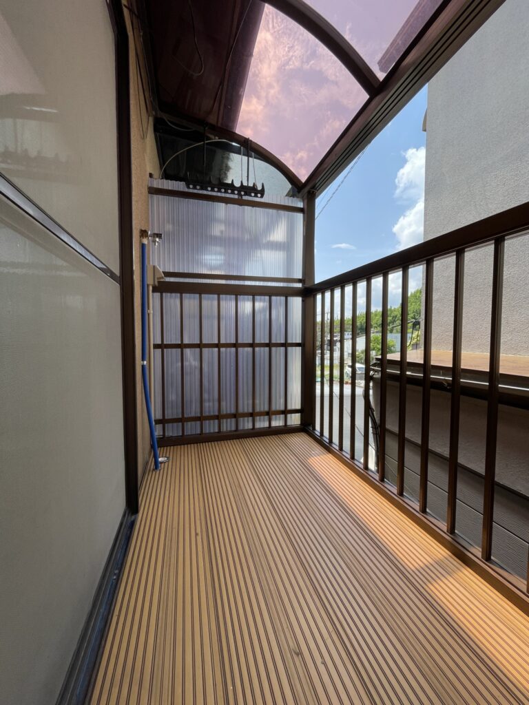 ベランダには、新しめのブラウンの樹脂パネル(ポリカ) が取り付けられており、ベランダから名神道路へと繋がっていく道が見えます。